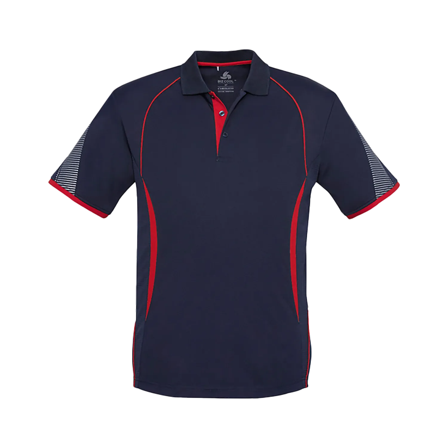 Stay protected and cool with the Biz Collection Mens Razor Short Sleeve Polo. Featuring UPF 50+ sun protection and breathable grid mesh underarm panels, this polo is designed for active comfort. Unique sleeve print details, bold contrast panels, and piping give it a standout look. The knitted collar with a contrasting placket adds a polished finish. Made from 100% polyester sports interlock at 155 GSM, it’s built for performance and durability. Great for custom screen printing or embroidery to make your mark.